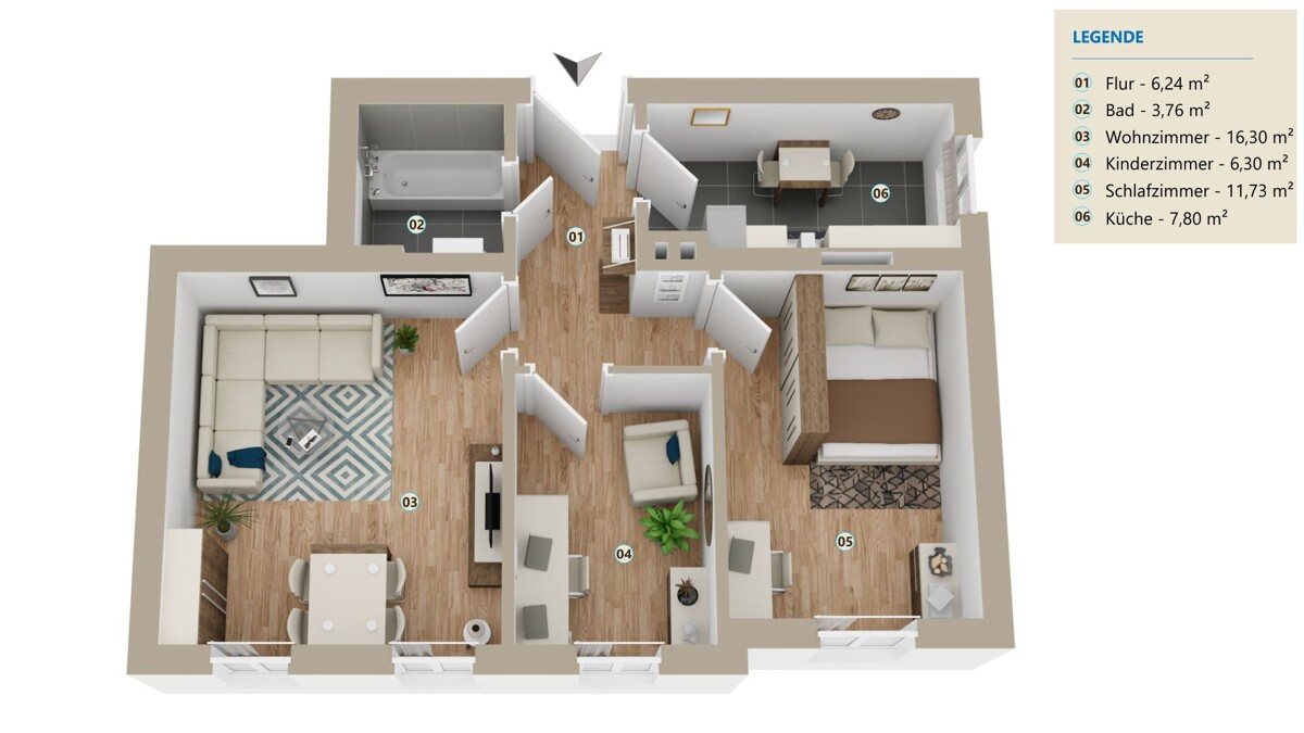 Alle Angaben wurden nach bestem Wissen erstellt, erheben jedoch keinen Anspruch auf Richtigkeit und Vollständigkeit. Die Grundrisse sind nicht maßstabsgerecht und dienen lediglich der Veranschaulichung. Visualisierungen, insbesondere die Einrichtungen dienen als Vorschlag für die spätere Einrichtungsgestaltung. Die vorliegenden Angaben sind als unverbindliche Information zu verstehen und können nicht als Rechtsgrundlage herangezogen werden. Bei den angegebenen Zimmergrößen handelt es sich um ca.-Größen. Rechtskräftig ist ausschließlich der notariell abgeschlossene Kaufvertrag.