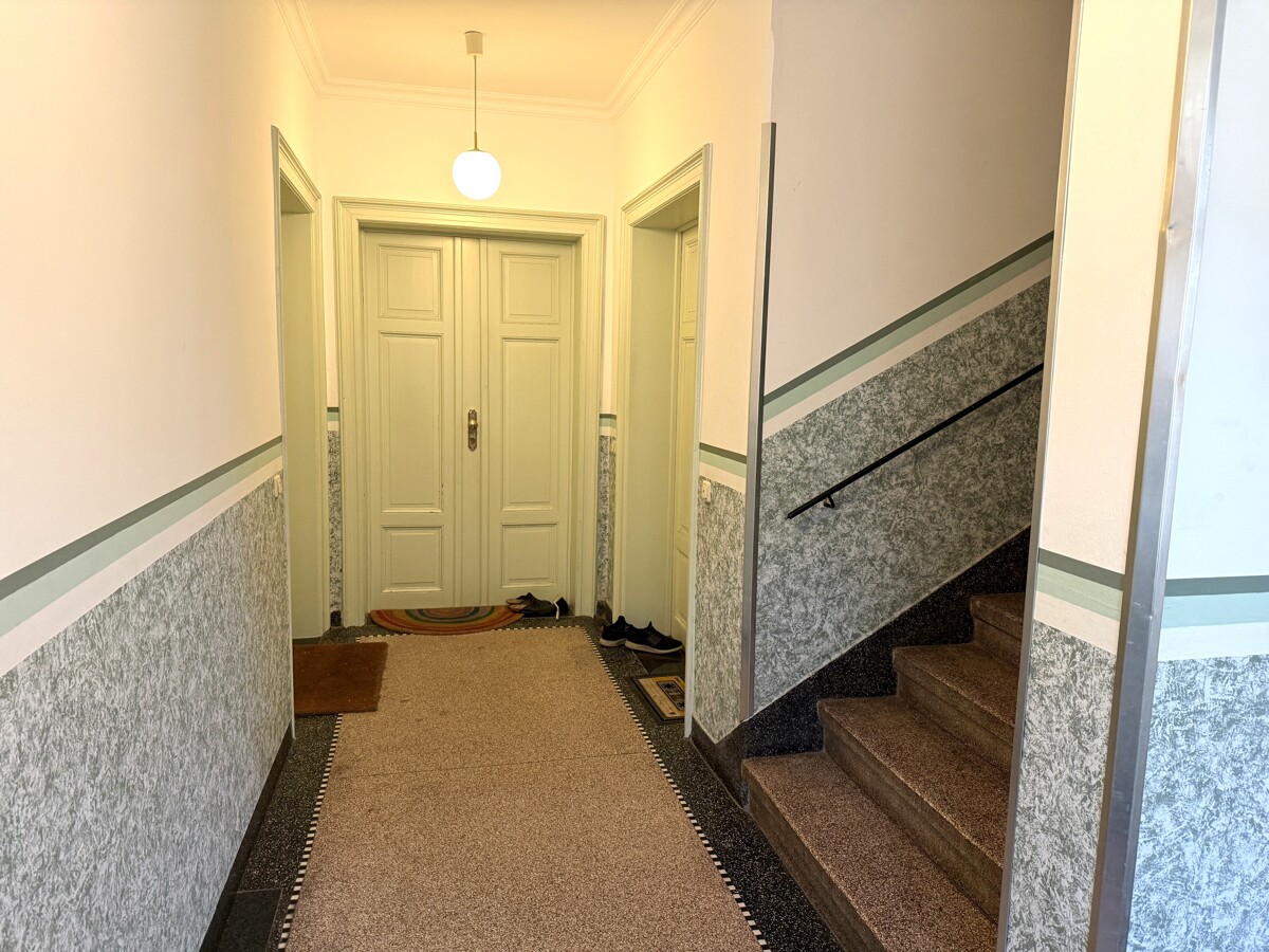 In den Wohnungen konnten die originalen Holztüren erhalten und aufgearbeitet werden. Sie verleihen den Räumen ihren historischen Charme und spiegeln die architektonische Qualität der Bauzeit wider. In Kombination mit der laufenden Pflege des Objekts entsteht so ein harmonisches Wohnambiente, das Tradition und Werterhalt in den Mittelpunkt stellt.